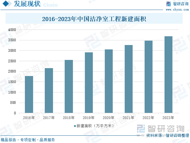 潔凈室工程是服務于高科技、國計民生的常青產(chǎn)業(yè),尖端科技的發(fā)展與居民日常生活質量的提升無不有賴于潔凈技術發(fā)展作為其幕后的支持。近幾年來,隨著空氣凈化核心領域技術實現(xiàn)根本性突破,國產(chǎn)凈化設備及系統(tǒng)集成快速成長,在產(chǎn)品質量、制作成本、凈化性能等方面取得長足進步,潔凈室相關技術與服務也從醫(yī)學、航空航天等高端產(chǎn)業(yè)逐漸向全社會滲透,在食品生產(chǎn)和流通各環(huán)節(jié)、高端裝備制造、大型數(shù)據(jù)中心、化工產(chǎn)品生產(chǎn),甚至美容化妝等領域都取得了廣泛的應用。目前,全球半導體、光電等電子信息產(chǎn)業(yè)在世界范圍內轉移,東亞、東南亞等地區(qū)已成為世界電子信息行業(yè)的主要市場和發(fā)展重心;同時由于我國醫(yī)藥衛(wèi)生、半導體、航空航天等事業(yè)的不斷發(fā)展,加速推動了潔凈室的市場化需求,從而帶動我國潔凈室工程產(chǎn)業(yè)的快速發(fā)展。2023年,中國潔凈室工程新建面積達3689萬平方米,同比增長6.04%。