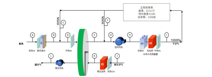 2)低濕需求空調(diào)房間,如正極輥壓間、正極分條間、正極模切間以及正極二分間等房間,其濕度控制需求為≤20%,以及正極涂布間、負(fù)極輥壓間、負(fù)極分條間、負(fù)極模切間以及負(fù)極二分間等房間,其濕度控制需求為≤45%,該需求通過(guò)冷卻除濕很難實(shí)現(xiàn),因此往往通過(guò)轉(zhuǎn)輪除濕機(jī)組處理后來(lái)滿足使用需求,機(jī)組中設(shè)置一級(jí)轉(zhuǎn)輪。